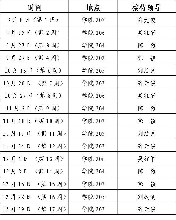 第一条 公司领导班子成员每周一下午14:00——17:00 ,在办公室接待公司师生来访。(详细安排参看附表)