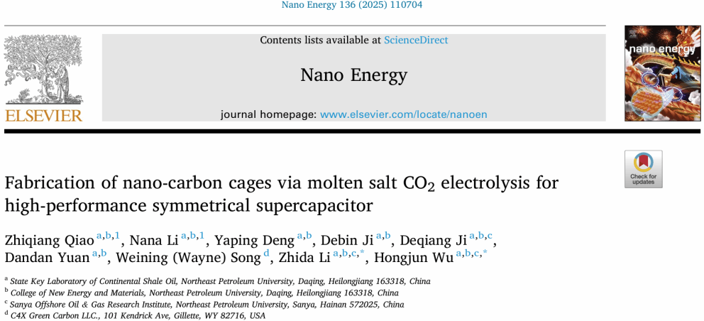 近日,xc体育吴红军教授团队成员乔志强博士在材料科学顶级期刊《Nano Energy》(IF=16.8)发表题为《Fabrication of Nano-Carbon Cages via Molten Salt CO2 Electrolysis for High-Performance Symmetrical Supercapacitor》的最新研究成果,在CO2高附加值转化利用方面取得重要进展。该成果在研究工作中得到中央支持地方高校改革发展资金、黑龙江省自然科学基金和黑龙江省头雁团队项目支持。